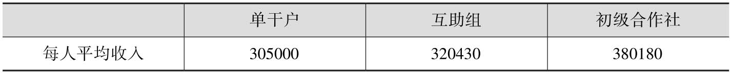 (2)初级合作化时期:互助合作基础上的生产关系形成的生产力有所进步,但仍有提高空间。首先,初级合作化基础上的生产关系形成的生产力体现了更大的优越性。1952年5月,山西长治反映试办的农业生产合作社情况显示,入社地的产出效果明显好过未入社的(互助组和单干户)表现。例如,东监漳受自然灾害的影响,是10个社中增产情况最差的,即使这样,入社地每亩平均二石零四,分别超过最好的互助组和单干户的一斗六和五斗四;如表3-7所示,从每人平均收入情况来看,也是农业初级生产合作社更胜一筹。合作社社员每人平均收入折款380180元,而互助组和单干户的人均收入情况分别是320430元和305000元。