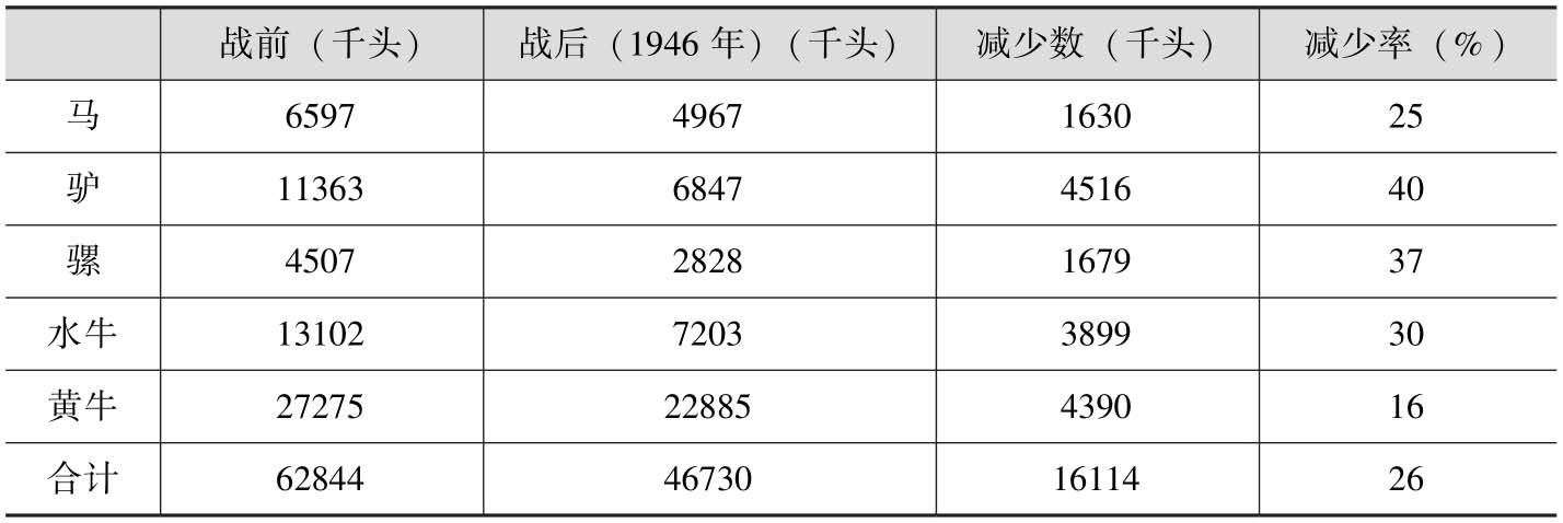 如表3-3所示,战前战后,部分牲畜量有了不同程度的下降,平均减少率约为战前的四分之一。