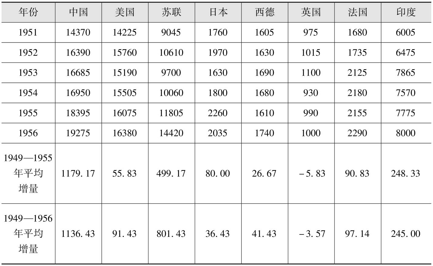 (3)高级农业合作化时期:初级合作化基础上的生产关系形成的生产力有所提升,但其优越性仍显不足。经历过土地改革、互助合作以及初级合作化运动,中国的农业生产力水平得到有效提升。如表3-10所示,1949—1955年,中国粮食产量年平均增量为1179.17万吨,而同一时期,美国、苏联、日本、法国和印度的粮食年平均增量分别为55.83万吨、499.17万吨、80.00万吨、90.83万吨以及248.33万吨。1949—1956年,我国粮食的年平均增长量与其他国家相比较高。可以看出,我国粮食产量在当时世界上具有绝对优势。但同时,我国主要工业产品还与其他国家有一定差距。如钢产量相比世界其他国家而言,差距还比较明显,如图3-6所示,我国钢产量水平仅仅超过所列国家中印度的钢产量,产量基础较为薄弱;如图3-7所示,1949—1956年,我国煤炭产量增长速度虽然比日本、法国和印度快,但截至1956年年底,我国煤炭产量总体数量不仅与美国、苏联相差较多,与西德、英国也有一定差距;如图3-8所示,1956年,我国发电量也仅仅超过印度,与世界上其他国家还有一定距离。要想实现工业化目标,并且没有内忧外患的顾虑,当时我国的工业化力量还远远不足。