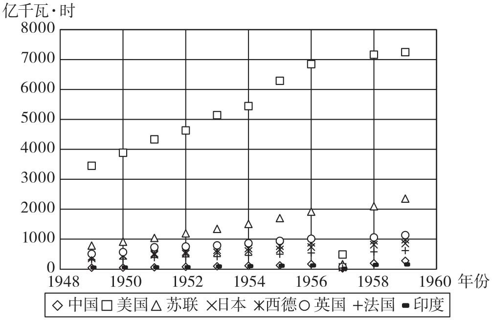 图3-11 1949—1958年中国和世界其他国家发电量对比