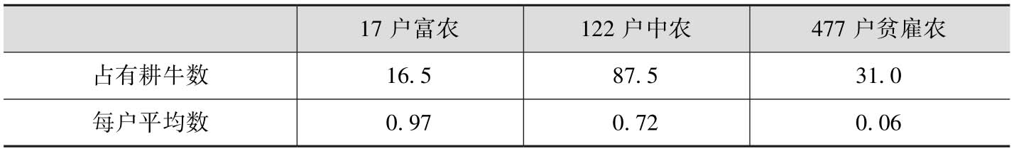 据湖南省长沙县统计数据,农村土地改革后,贫雇农占有的耕牛数仍十分缺乏,与其他阶层相比,差距过大。石碑乡的具体情况是:富农户均拥有的耕牛最多,中农次之,情况最差的为贫雇农。富农、中农、贫雇农户数分别为17户、122户、477户,其相对应的耕牛数量分别为16.5头、87.5头和31.0头,户均耕牛拥有量依次递减。