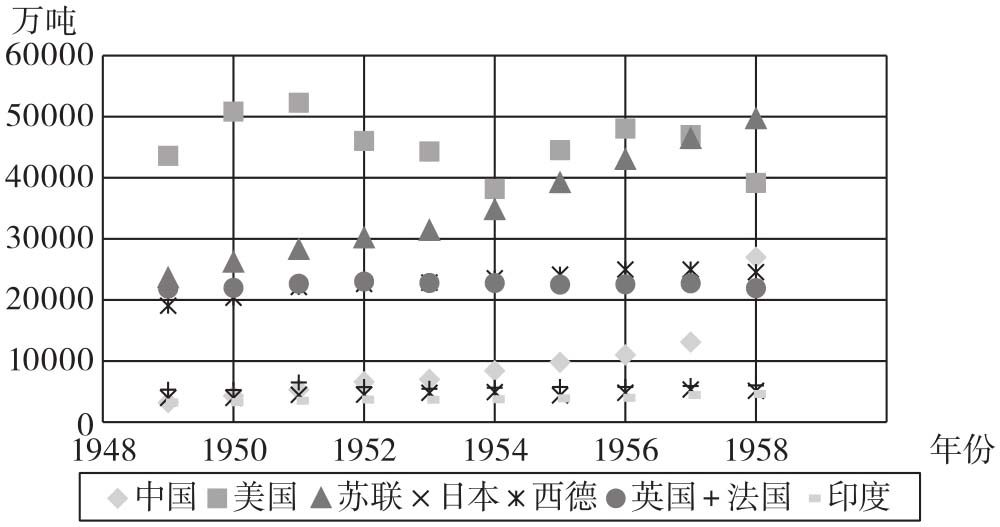 图3-10 1949—1958年中国和世界其他国家煤炭产量对比