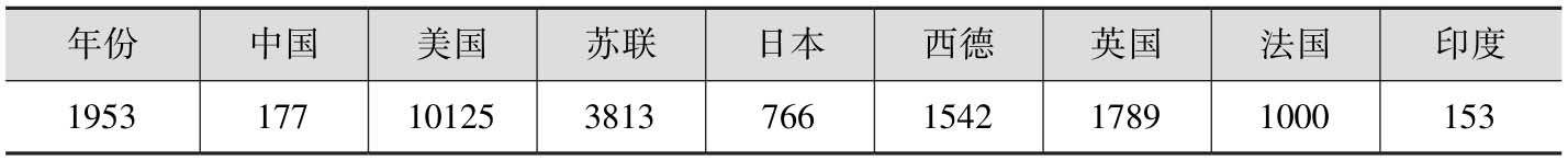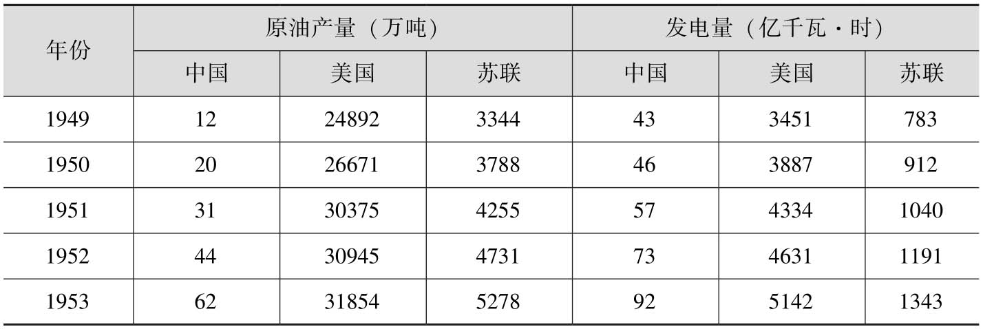 表3-9 1949—1953年中国、美国、苏联原油产量和发电量对比