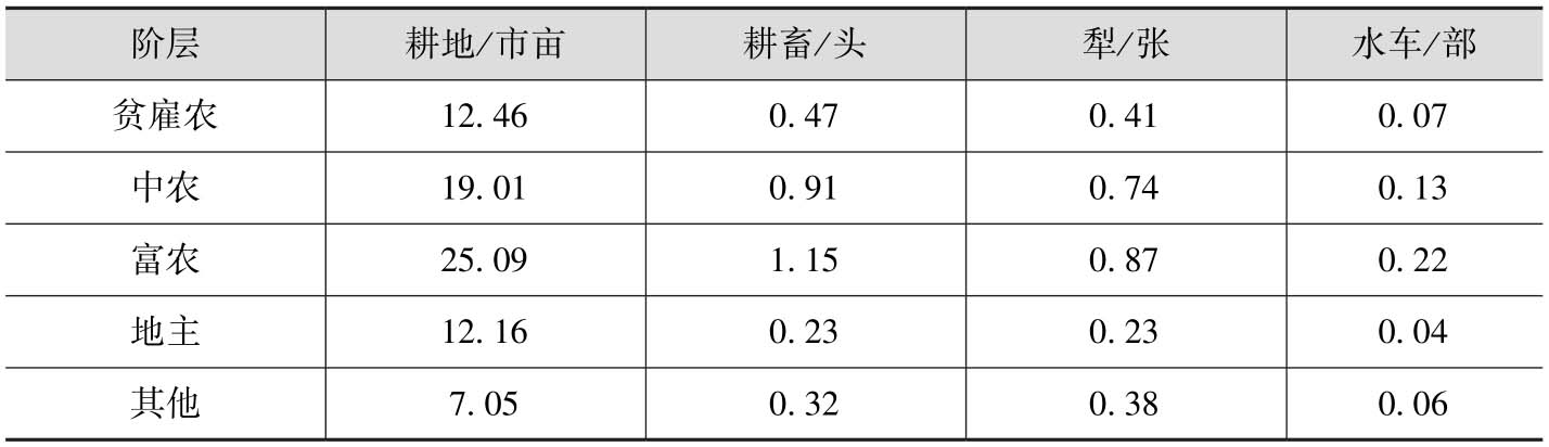 如表3-6所示,可以计算得出,每户富农平均耕牛为0.97头,每户平均不到一头;每户中农平均占有耕牛0.72头,和富农相比有一些差距;但是每户贫雇农平均占有耕牛则只有0.06头,数据上和前两者相差很大,贫雇农对于耕牛占有十分缺乏。长安县高家湾村的调查情况也呈现出同样的特点:全村共167户农民,其中中农52户,雇农8户,贫农107户,在这些阶层群体中没有牲口的户数分别是5户、8户以及71户。