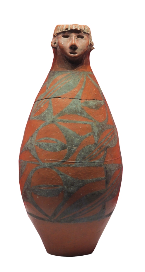 人头形器口彩陶瓶巧妙地将女孩的形象和葫芦瓶融为一体,瓶身绘着精美的黑彩纹饰,瓶口为女孩头部,额头留着整齐的刘海,眼睛和嘴巴雕刻成孔洞状,鼻子挺拔,小嘴微张,双耳穿孔。