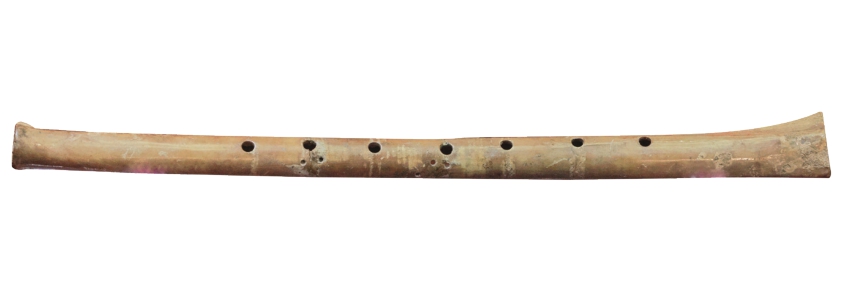 这支骨笛出土于贾湖遗址,采用涉水禽类的长骨制作而成。笛子上有七个孔,能够发出完整的七声音阶,是中国目前出土最早的乐器,被誉为“中华音乐文明之源”,也有观点认为骨笛最初可能是古人观测天象节气的重要工具。