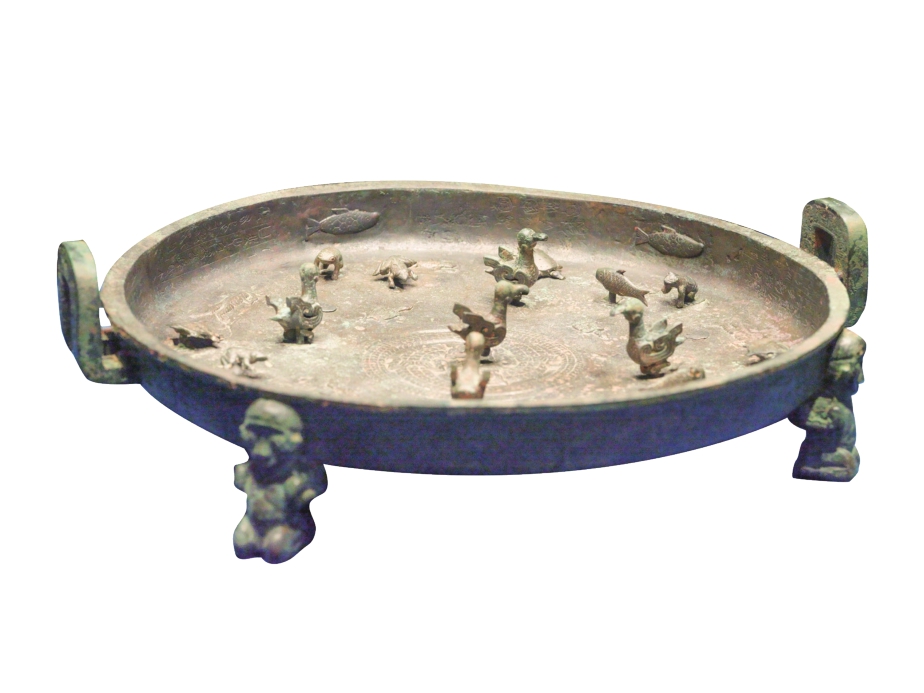 春秋战国时期,诸侯国常常通过联姻的方式来加强联系。晋公盘是“春秋五霸”之一的晋文公重耳为其宗室长女孟姬出嫁楚国而准备的嫁妆。这是一件盥洗青铜器,底部中央饰有两只浮雕盘龙,盘内则是一群水鸟、乌龟、青蛙和游鱼等动物,它们形态各异,栩栩如生。盘内圆雕动物均能360度转动,鸟嘴可开合,乌龟头部也能伸缩,生动有趣,极具巧思。