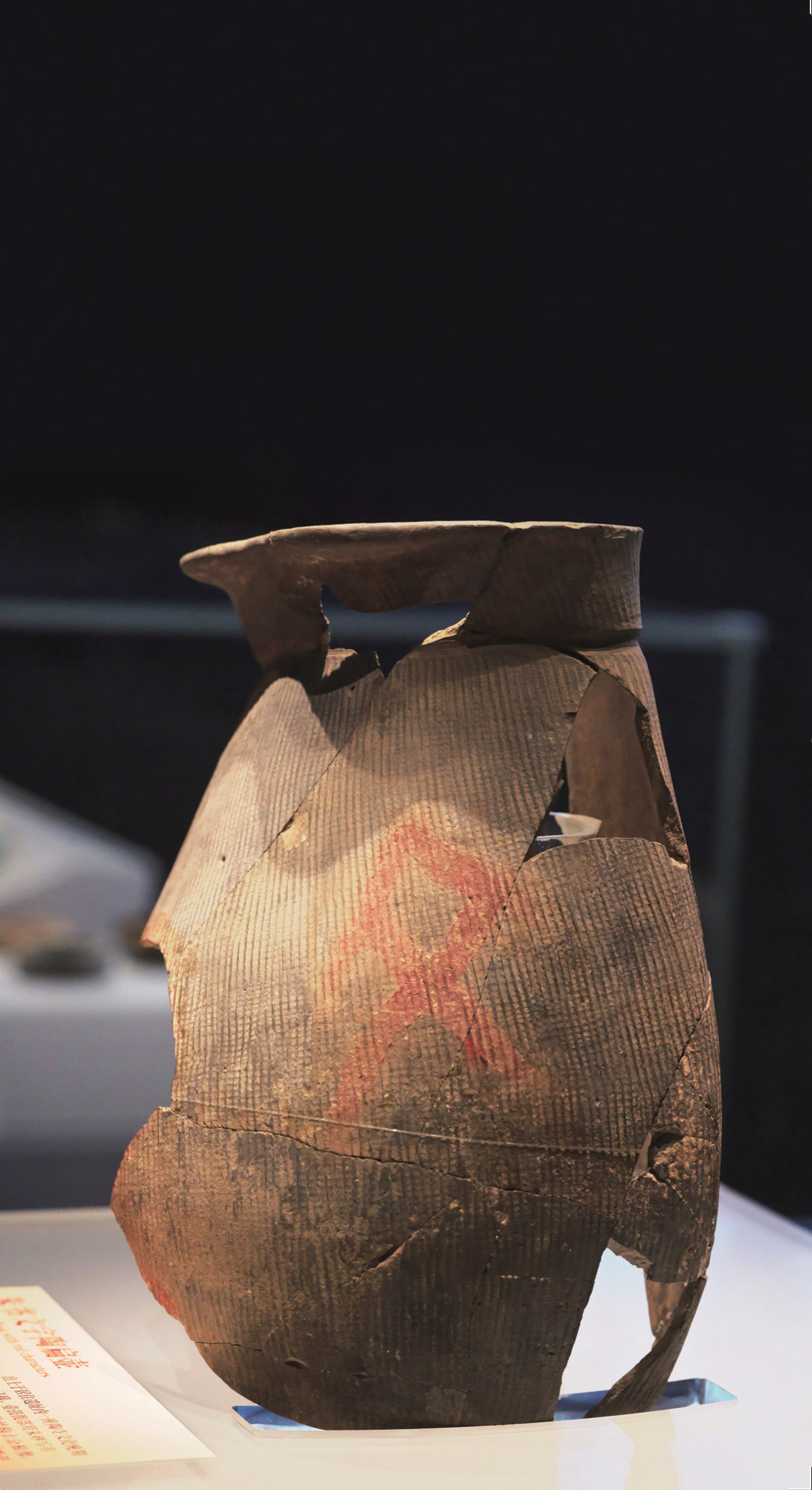 这件陶扁壶为汲水器,出土时已残破。它鼓凸的腹部一侧,用朱砂写了一个形似甲骨文的“文”字,而另一侧较扁平的部分也有两个神秘字符,尚未得到破译。陶扁壶破损处的周围,被细致地涂上了朱砂。