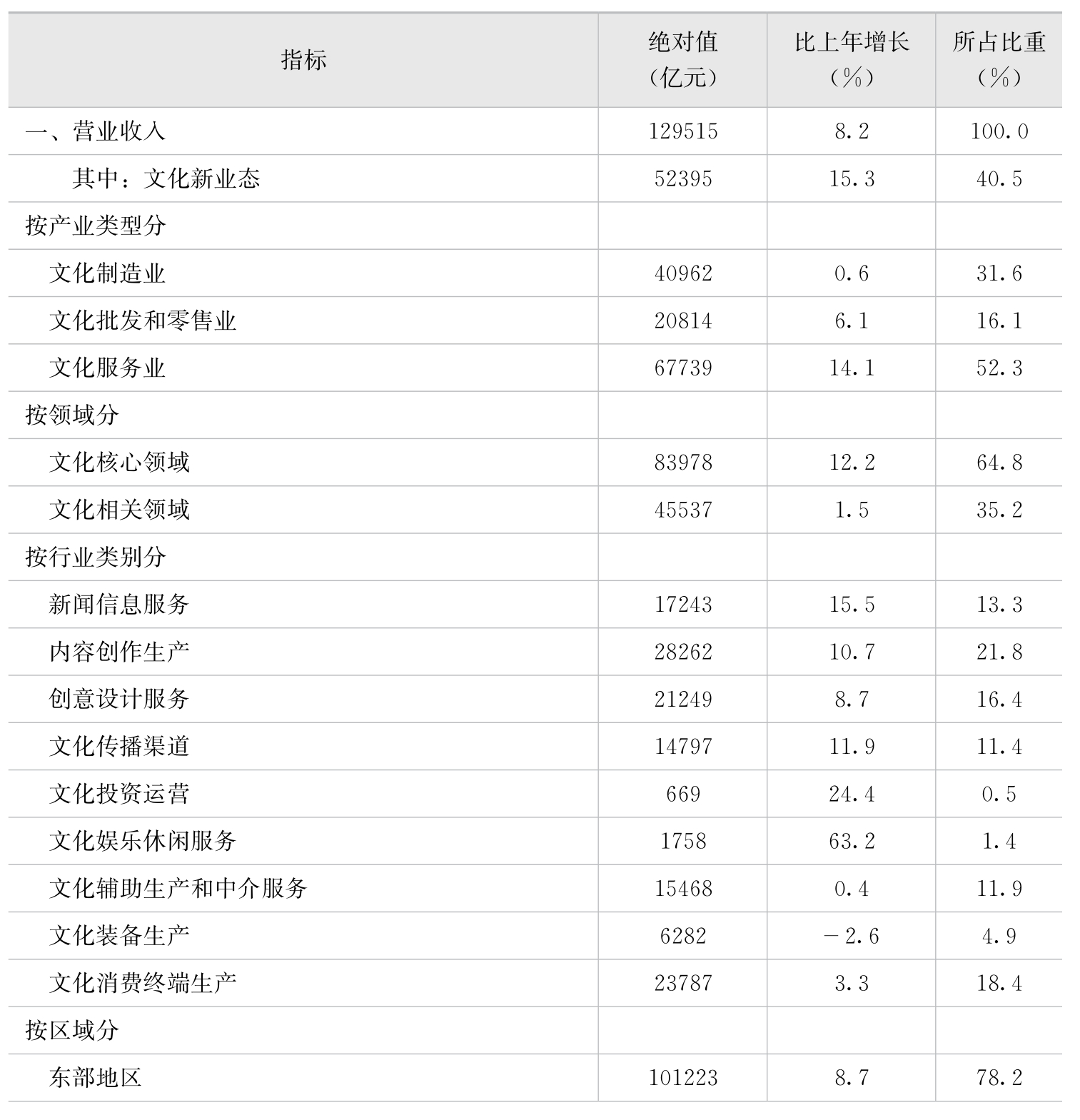 2023年国家统计局数据同时显示,从产业类型来看,文化制造业实现营业收入40962亿元,比上年增长0.6%;文化批发和零售业实现营业收入20814亿元,比上年增长6.1%;文化服务业则实现营业收入67739亿元,比上年增长14.1%。文化服务业营业收入占全部规模以上文化企业的比重为52.3%,占比高于上年2.7个百分点。这一数据表明,文化服务业在文化产业中的占比和增长速度均较为显著,显示出其在文化产业中的主导地位和巨大潜力。从行业类别来看,新闻信息服务实现营业收入17243亿元,比上年增长15.5%;内容创作生产实现营业收入28262亿元,比上年增长10.7%;创意设计服务实现营业收入21249亿元,比上年增长8.7%;文化传播渠道实现营业收入14797亿元,比上年增长11.9%;文化投资运营实现营业收入669亿元,比上年增长24.4%;文化娱乐休闲服务实现营业收入1758亿元,比上年增长63.2%;文化辅助生产和中介服务实现营业收入15468亿元,比上年增长0.4%;文化装备生产实现营业收入6282亿元,比上年下降2.6%;文化消费终端生产实现营业收入23787亿元,比上年增长3.3%。其中,文化娱乐休闲服务行业实现营业收入1758亿元,由上年下降14.7%转为增长63.2%,显示出文化消费的巨大潜力。整体对比2022年数据,2023年九大文化产业呈现“八升一降”整体向好局面。分区域来看,东部地区实现营业收入101223亿元,比上年增长8.7%;中部地区实现营业收入15394亿元,比上年增长3.6%;西部地区实现营业收入11688亿元,比上年增长10.0%;东北地区实现营业收入1210亿元,比上年增长5.4%。各地区均增长明显。