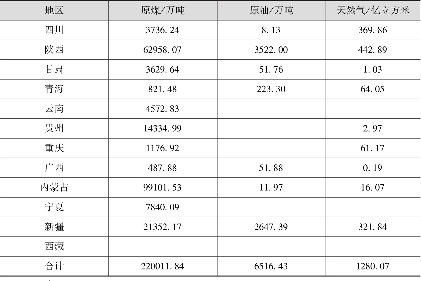 。2018年,我国原煤产量为36.98亿吨,原油产量为18932.42万吨,天然气产量为1601.59亿立方米。西部地区主要能源产品产量如表1-1所示。