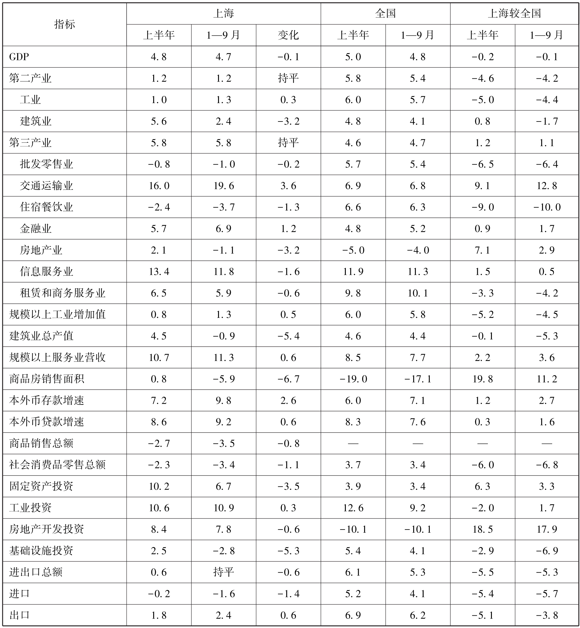 表1 2024年前三季度上海主要经济指标运行情况