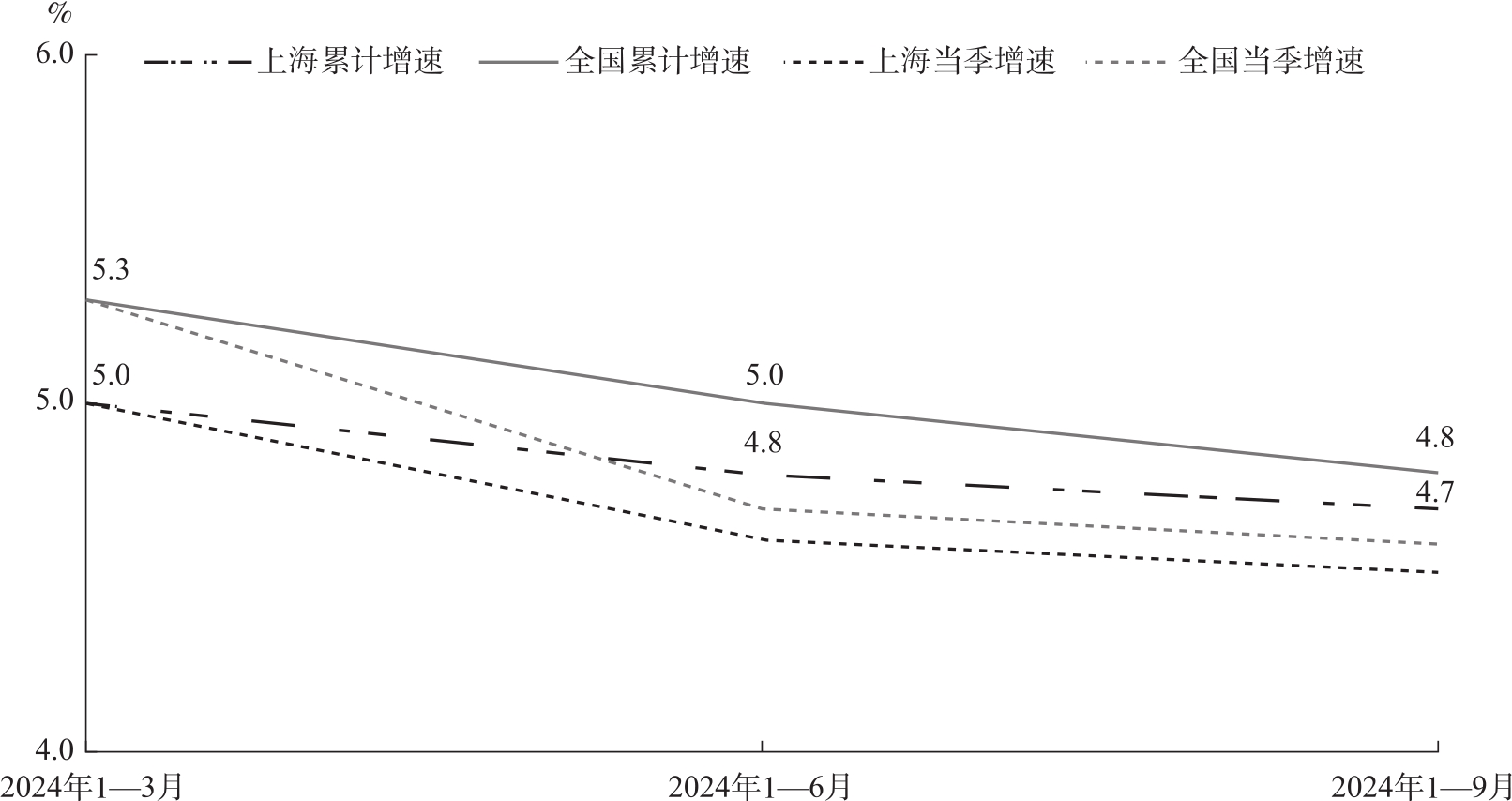 2024年前三季度,上海GDP同比增长4.7%,增速较上半年回落0.1个百分点,与全国(4.8%)差距收窄0.1个百分点,经济运行呈现总体平稳、依然承压、动力分化的特点。