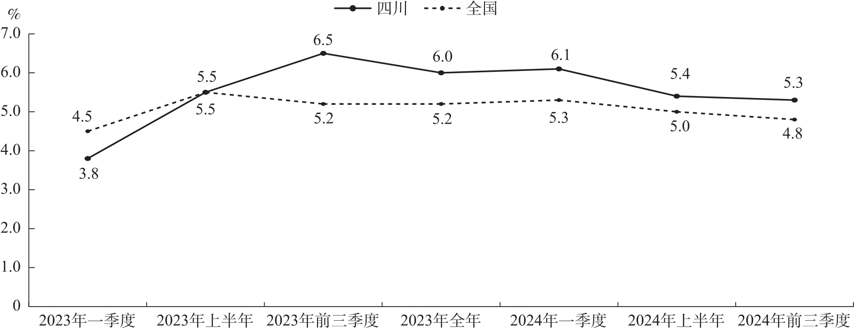 图1 2023年以来四川与全国地区生产总值分季度同比增速