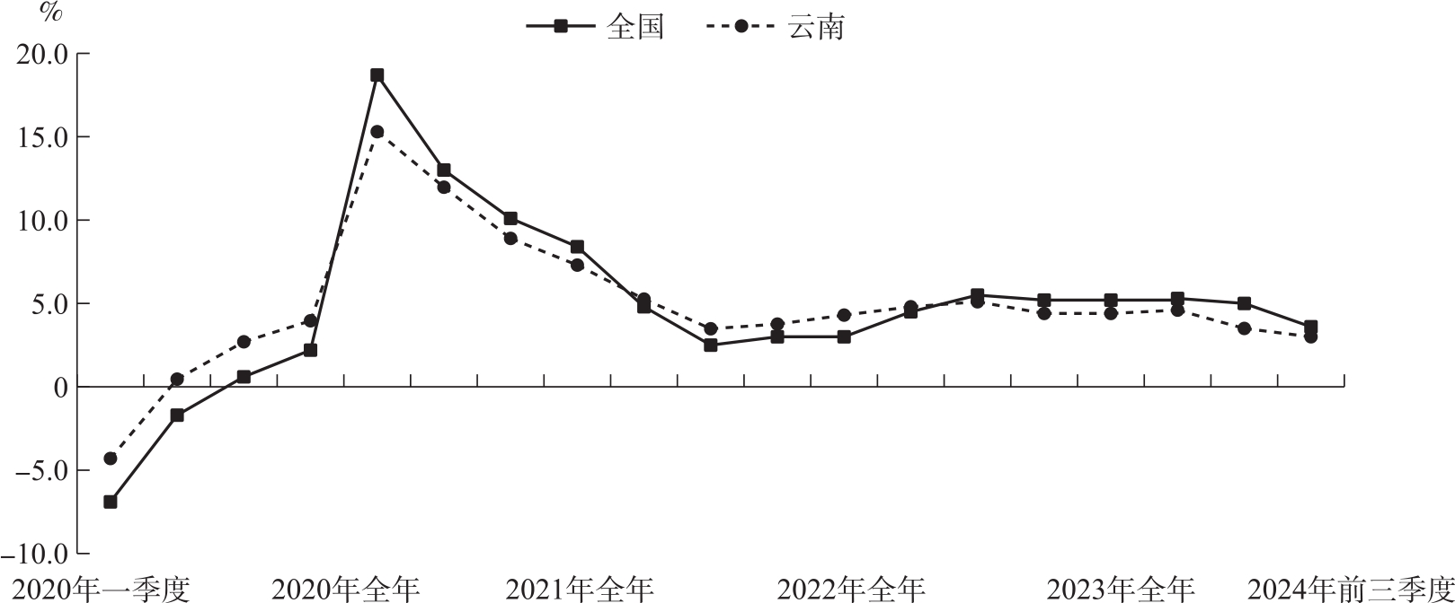 图1 2020年以来云南省与全国地区生产总值同比增速