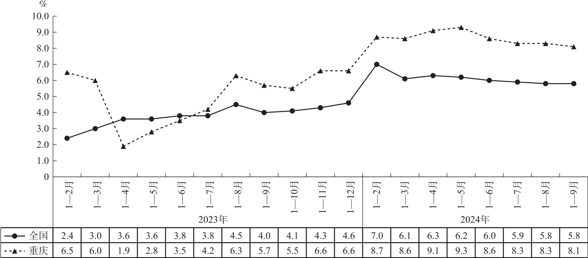 图1 全国和重庆规模以上工业增加值累计增速对比