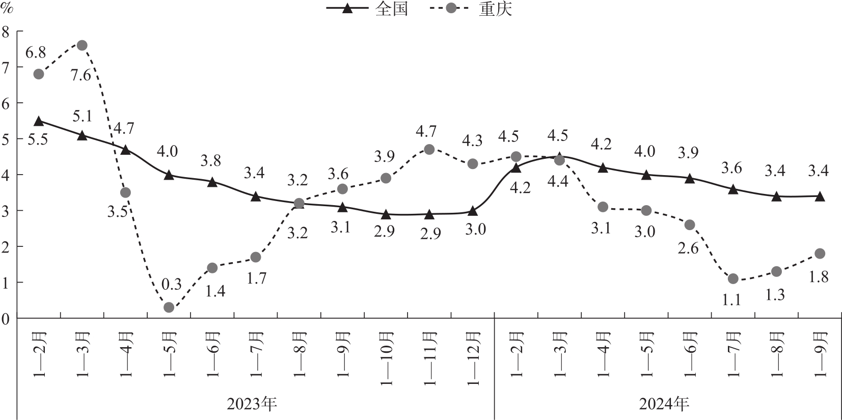 图1 2023年以来重庆及全国投资增长情况(累计同比)