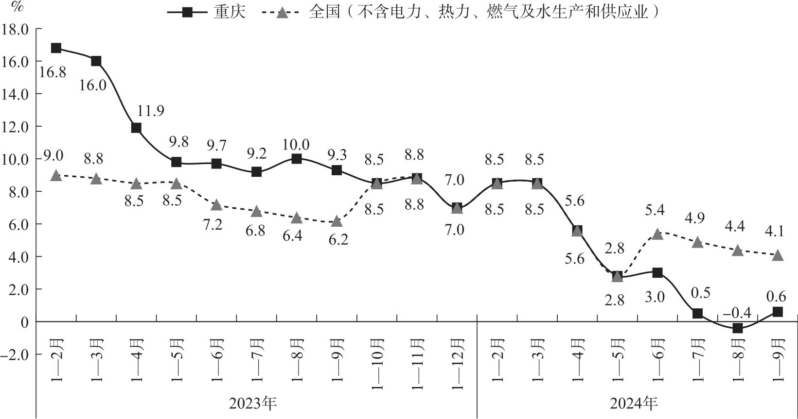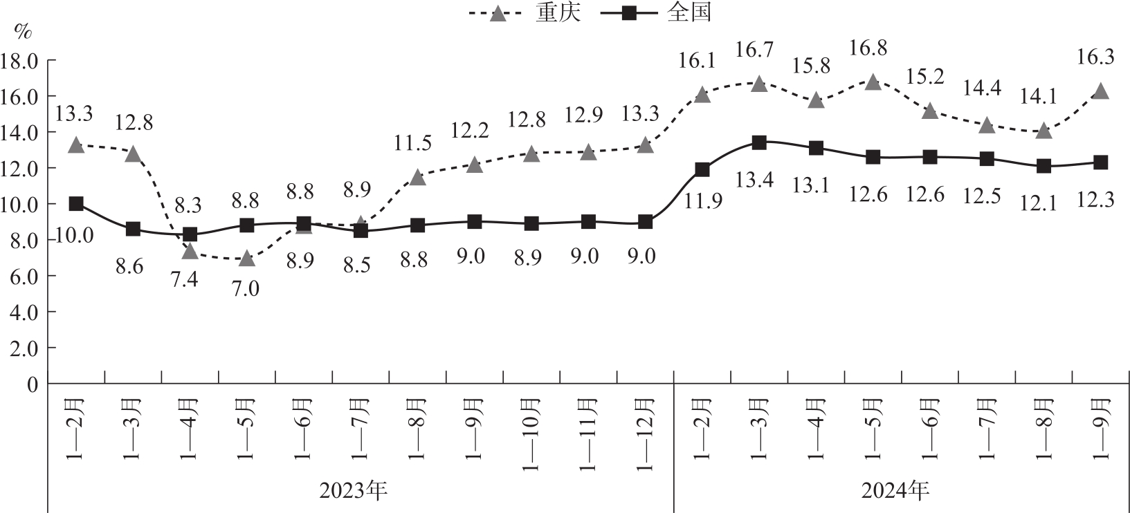 图3 2023年以来重庆及全国工业投资增长情况