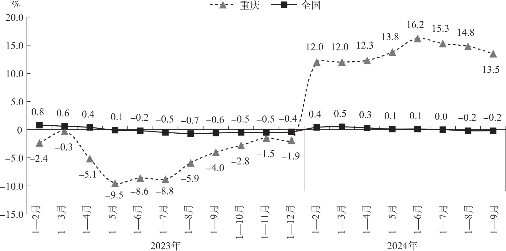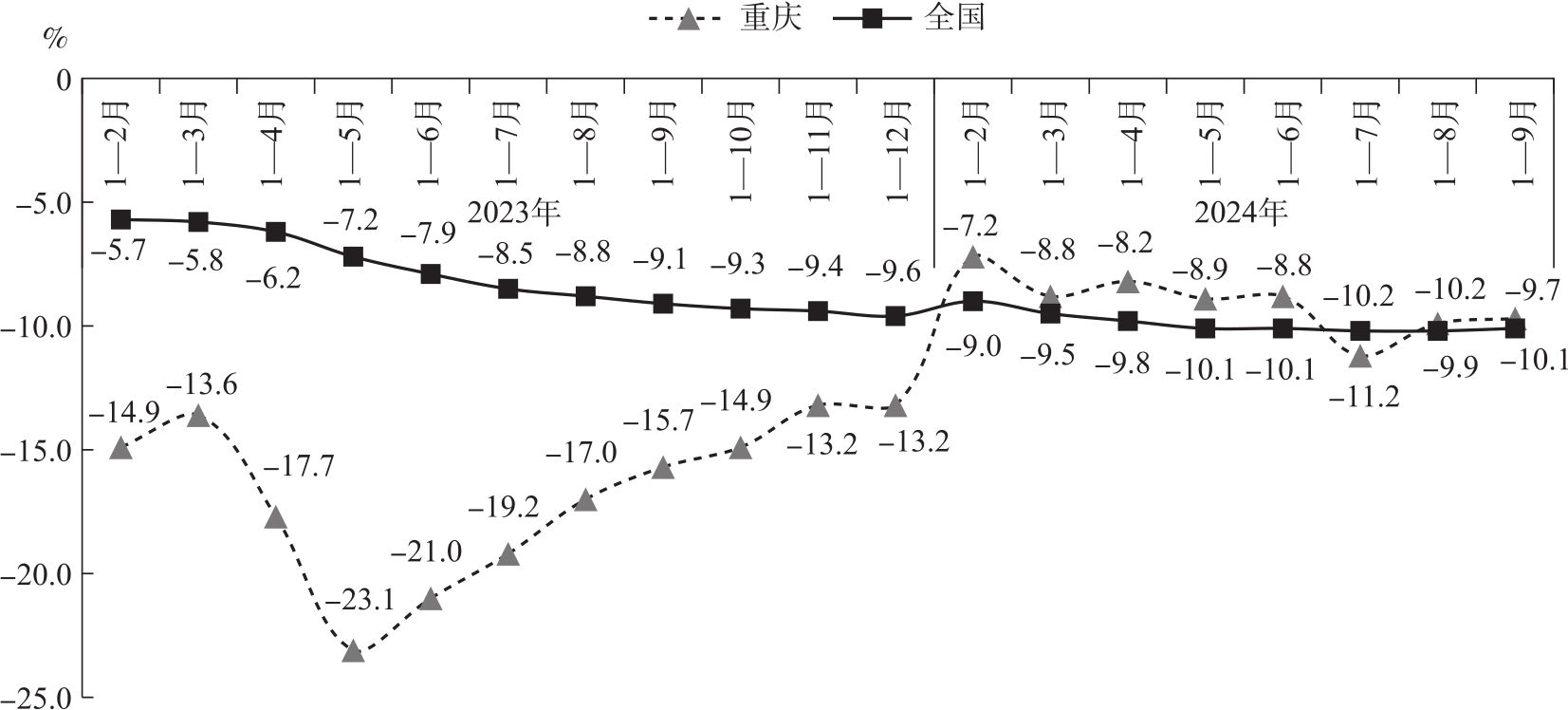 图4 2023年以来重庆及全国房地产开发投资增长情况