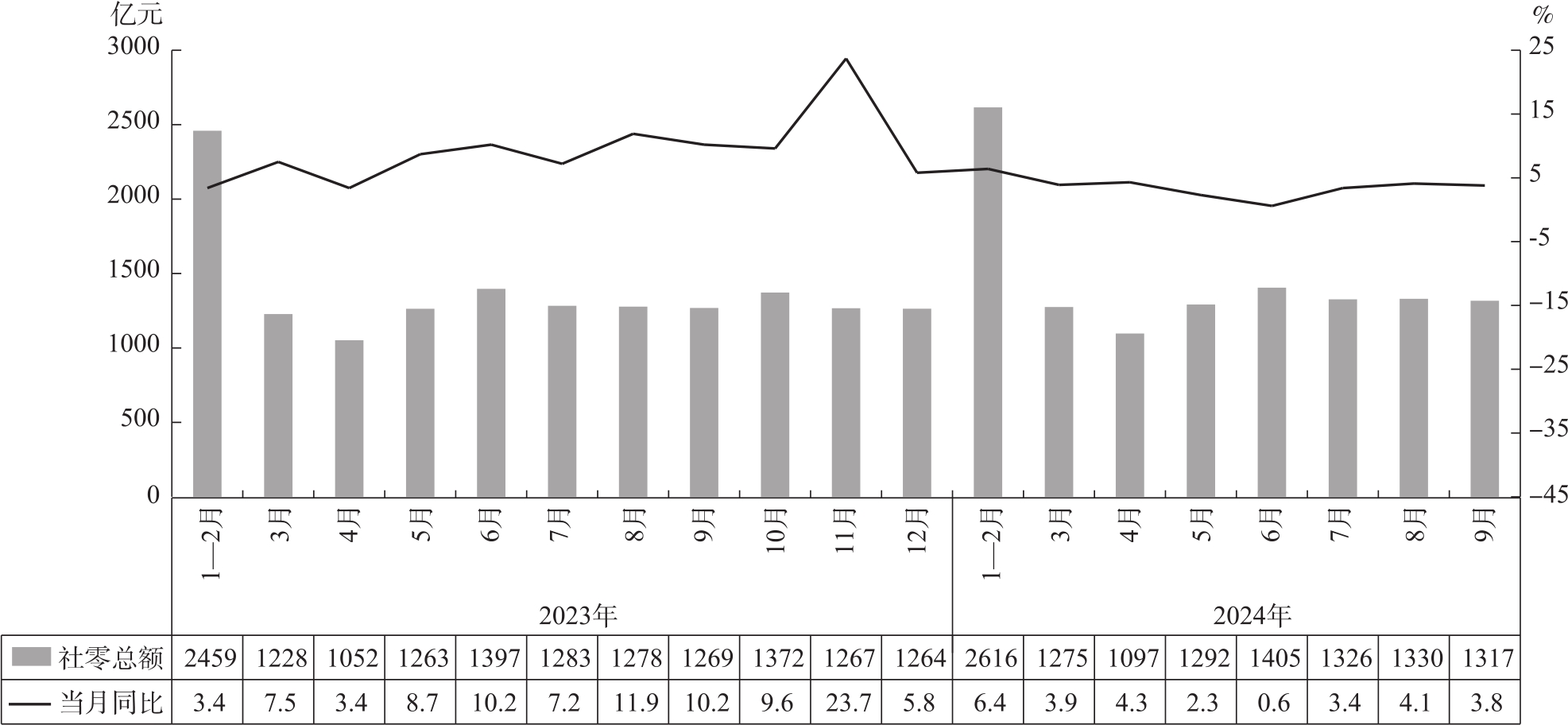 图1 2023年以来重庆社会消费品零售总额及增速变化情况