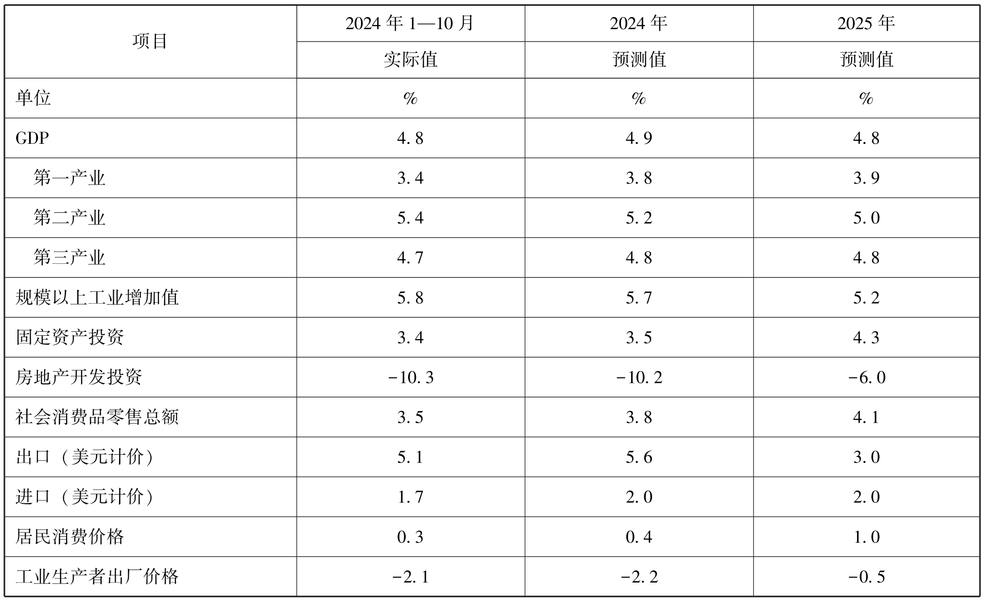 2024年以来,面对复杂多变的内外环境,党中央科学决策,加大宏观调控力度,着力深化改革开放、扩大国内需求、优化经济结构,我国经济运行呈现总体平稳、稳中有进、质效向好的态势,能够较好实现全年预期增长目标。展望2025年,当今世界动荡不安、冲突频发,贸易摩擦风险显著上升,国内仍面临需求不足、转型阵痛、企业内卷、房地产市场调整等问题,但在政策加力、改革发力、开放助力、转型给力、增长潜力等多力协同作用下,国内经济将延续稳中有进态势,新质生产力加快形成,物价水平温和回升,预计我国经济将增长4.8%左右。