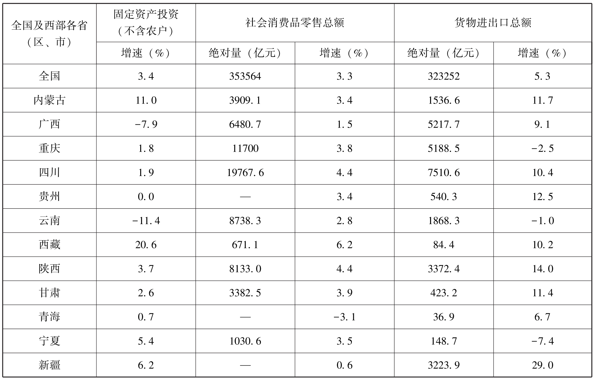 服务业承压增长。受房地产、金融市场不景气的影响,西部地区服务业增长明显承压,增加值增速同比整体放缓,对经济增长的拉动作用明显弱于工业。1—9月西部11个省(区、市)的服务业增速比上年同期下滑,除重庆(5.8%)、四川(5.6%)外,其他省(区、市)增速低于全国平均水平(4.7%)。分行业看,交通运输、仓储物流、居民服务、文化旅游保持较快增长,四川交通运输仓储和邮政业增长8.2%,甘肃接待游客、旅游消费分别增长15.6%、25%,贵州旅游接待总人数、总收入分别增长11%、14.8%,重庆文化体育和娱乐业增长27%。同时,现代服务业继续保持良好发展态势,四川、云南租赁和商务服务增加值分别增长19.8%、15.7%,信息传输、软件和信息技术服务业分别增长12.5%、14.7%;陕西租赁和商务服务营业收入增长15.9%;重庆规模以上互联网和软件行业营业收入增长21%。房地产业继续呈下滑趋势,各省(区、市)商品房销售面积、销售额仍徘徊在10%~30%的负增长区间。受资本市场不景气、金融产品创新能力不强、金融核算口径调整等因素影响,西部地区金融业增加值下滑较快。