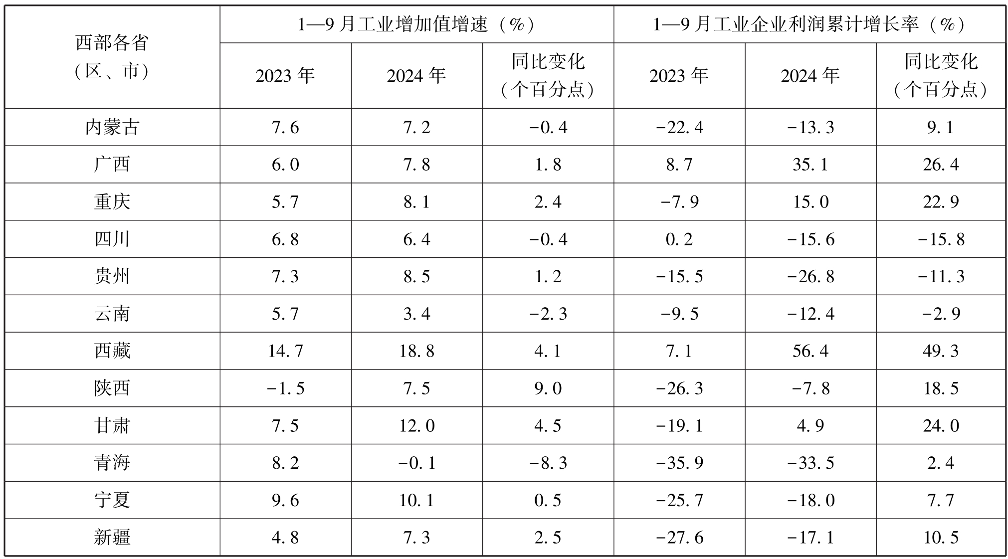 表3 2023年、2024年1—9月西部各省(区、市)工业增加值、企业利润增速