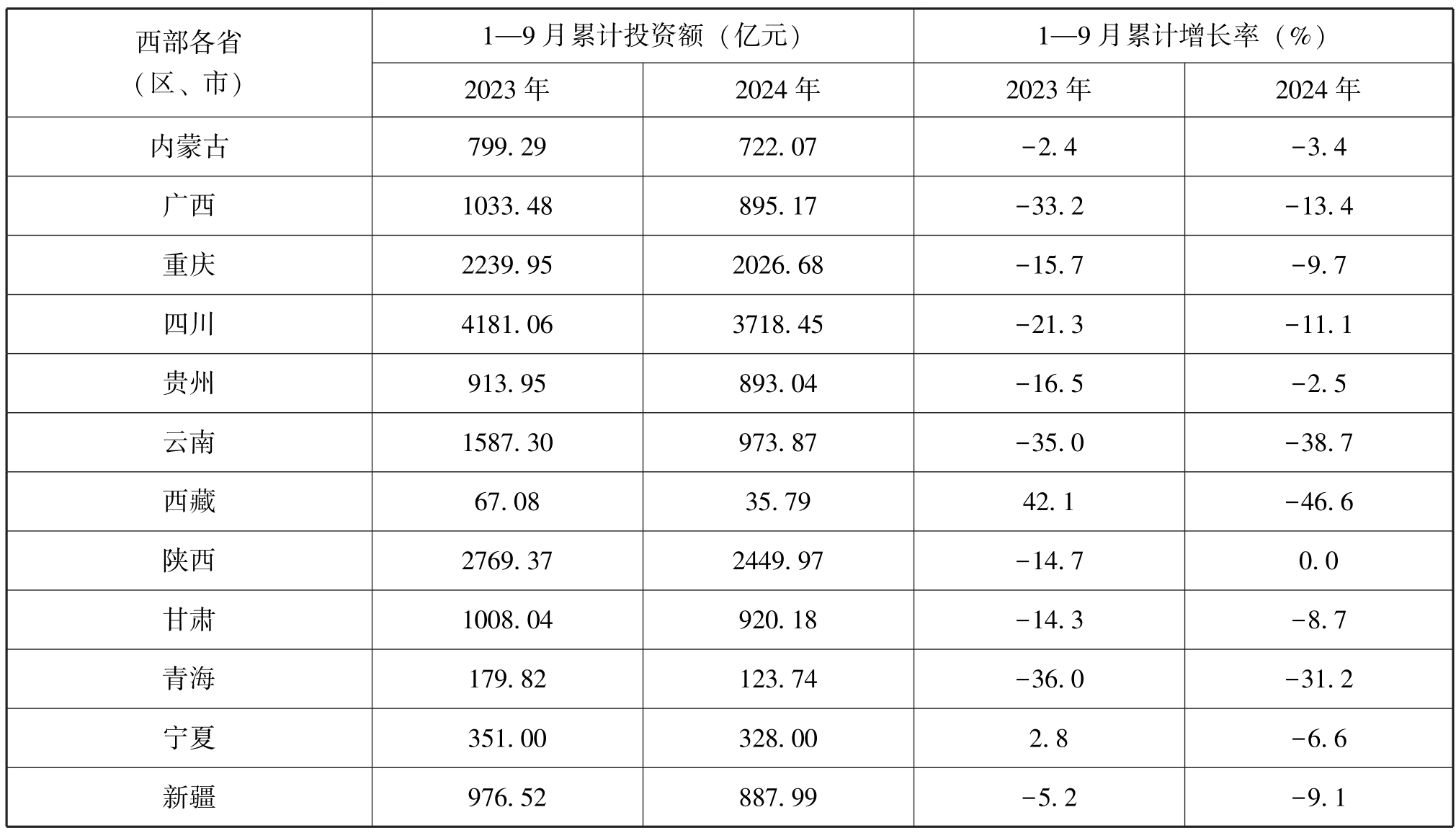 表4 2023年、2024年1—9月西部各省(区、市)房地产开发投资额及增速