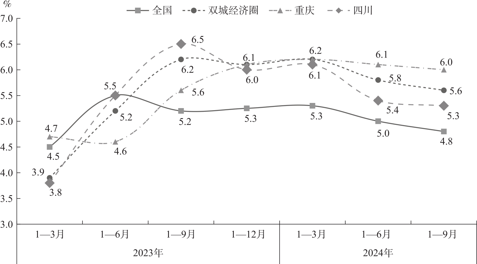 图1 2023年以来全国、双城经济圈以及重庆、四川GDP季度累计增速