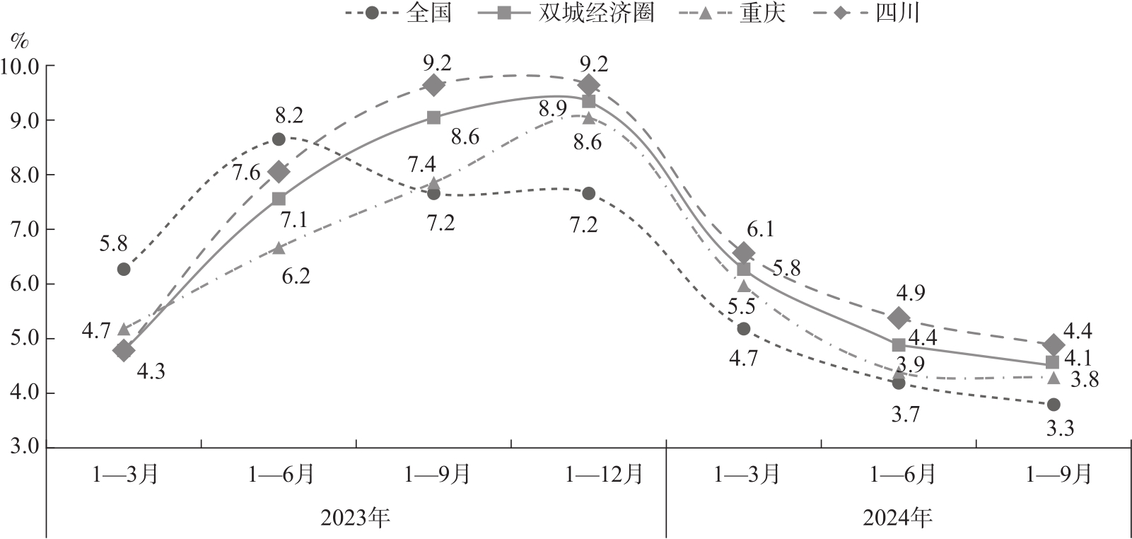 图3 2023年以来双城经济圈以及重庆、四川社会消费品零售总额季度累计增速