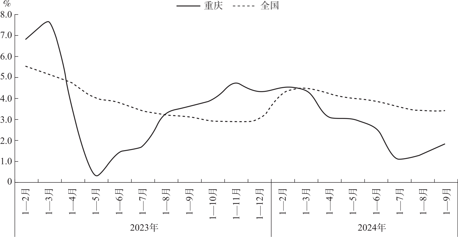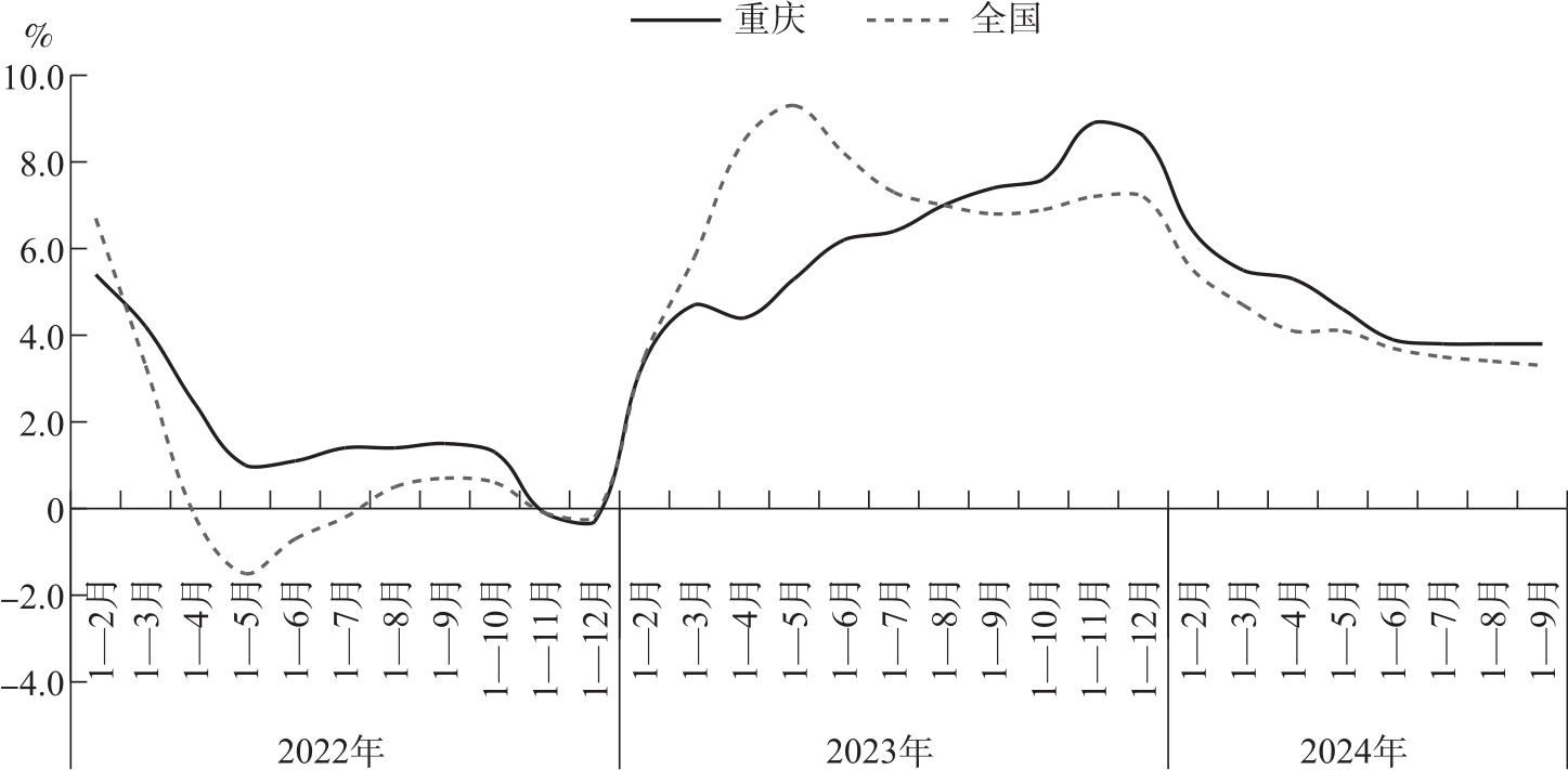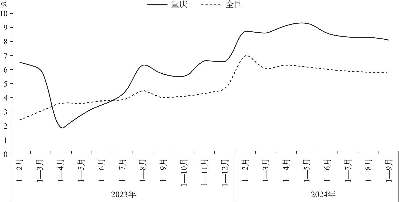 图2 重庆及全国规模以上工业增加值累计增长情况