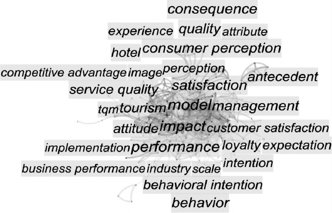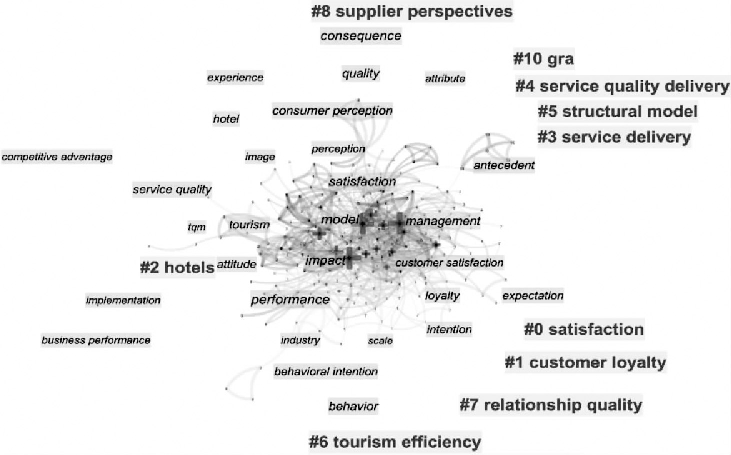 关键词是论文核心思想和主题的凝练,分析某领域的关键词共现情况有助于了解该领域的研究热点。关键词共现分析发现(见图1-3),国外旅游质量研究热频关键词有model、impat、satisfaction、perception、tourism、performance、customer satisfaction、management、industry、loyalty、behavioral intention、consumer perception、service quality、intention、attitude、scale、hospitality、antecedent、image、behavior、hotel、expectation等,这些关键词出现频次大于10,说明国外旅游质量的研究主要集中在评价模型,人的感知、满意度、行为意图,旅游业的绩效、效率,旅游业的服务质量等方面。涵盖乡村旅游、旅游教育、航空旅游、中医药旅游、森林旅游等不同旅游细分领域的质量问题,对基于游客感知的旅游质量更为关注。从关键词聚类分析结果看(见图1-4),国外旅游质量关键词可细分为satisfaction、customer loyalty、hotels、service quality、structural model、tourism efficiency等10个有效聚类。