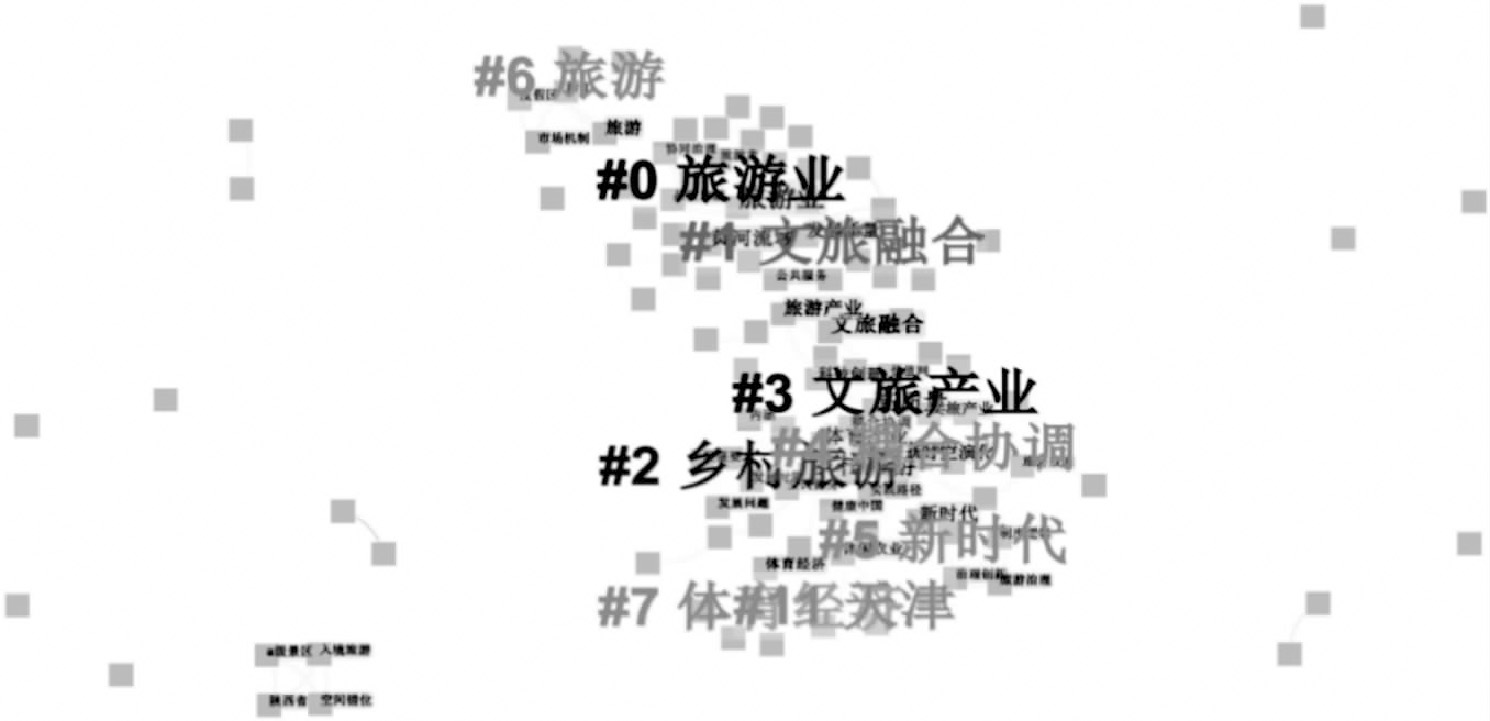 对国内旅游高质量发展关键词进行CiteSpace聚类分析。由图1-8可知,国内旅游高质量发展研究可细分为8个有效聚类,按所含关键词规模大小依次为#0旅游业、#1文旅融合、#2乡村旅游、#3文旅产业、#4耦合协调、#5新时代、#6旅游、#7体育经济。