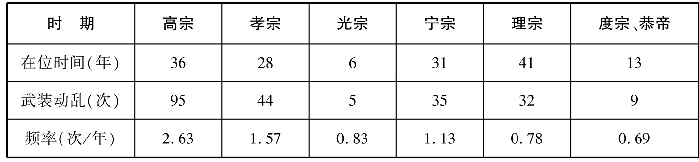我们据此将南宋各朝发生的动乱次数加以统计,制成下表: