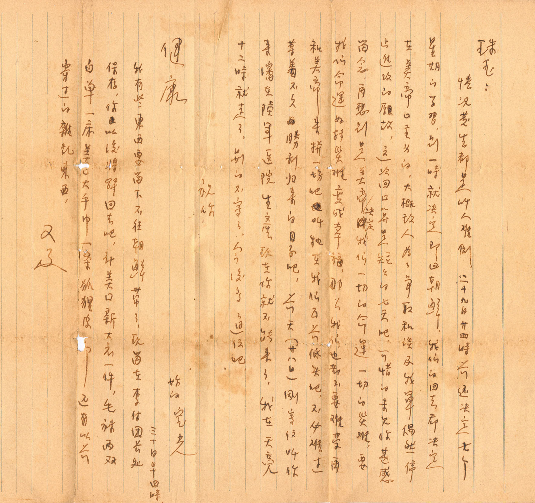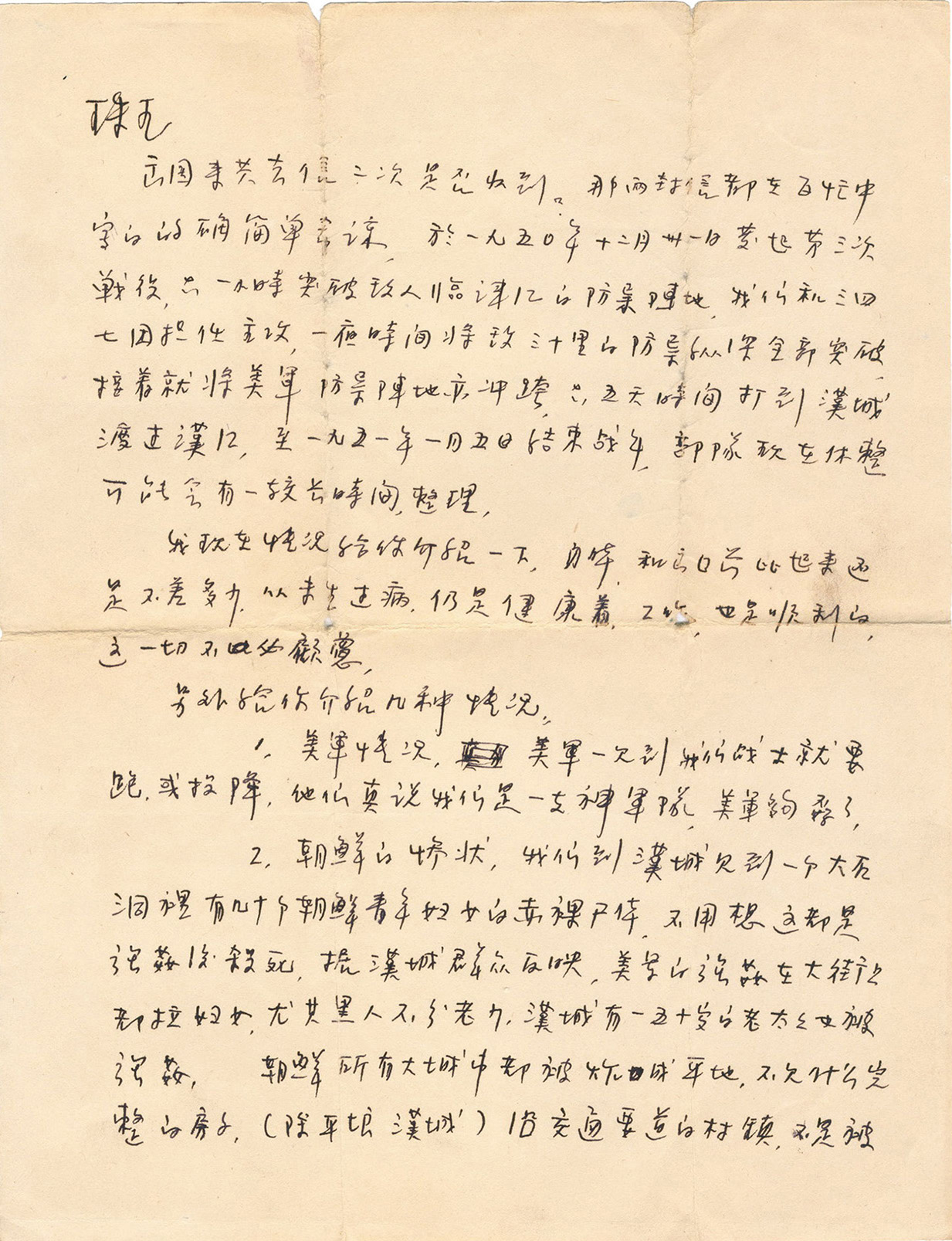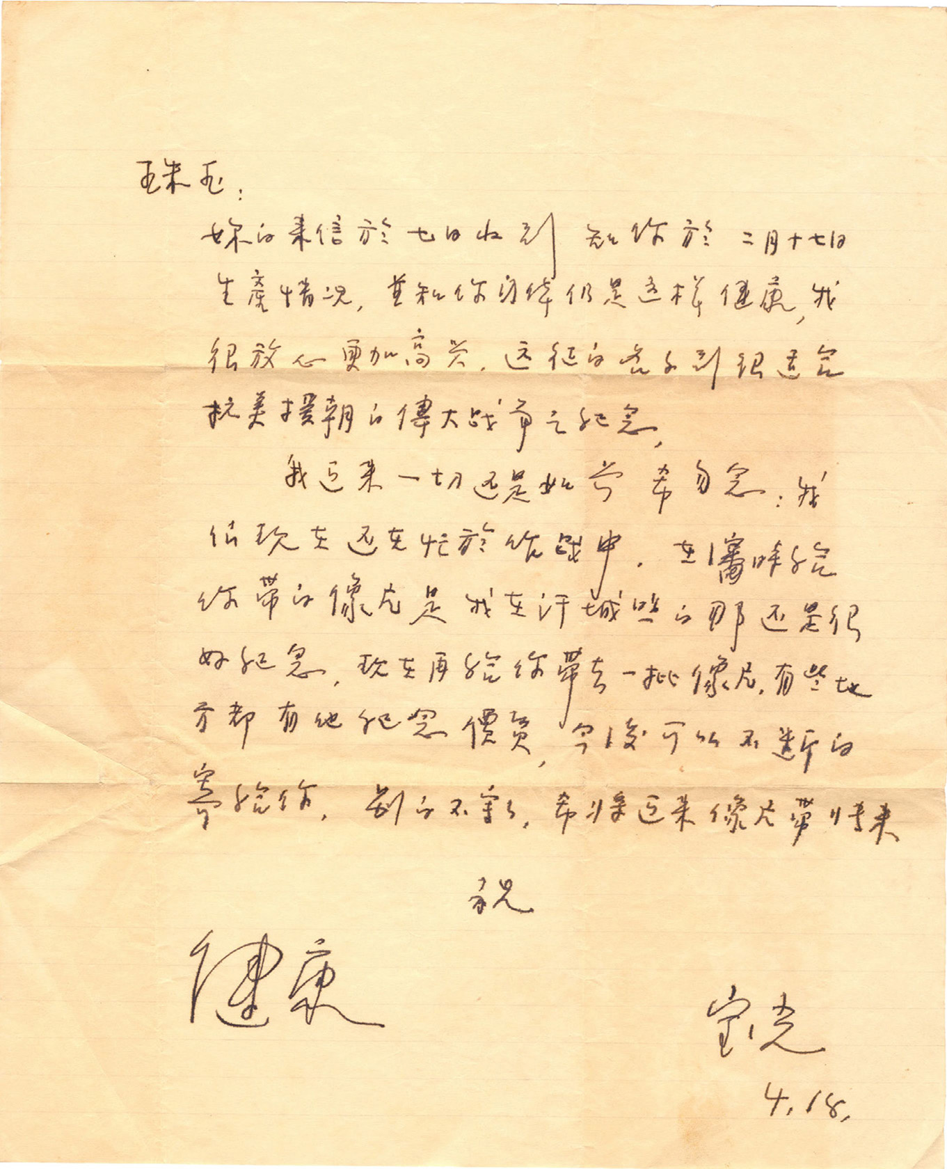 你的来信于七日收到,知你于二月十七日生产情况 ,并知你身体仍是这样健康,我很放心更加高兴,远征的名子到很适合抗美援朝的伟大战争之纪念。