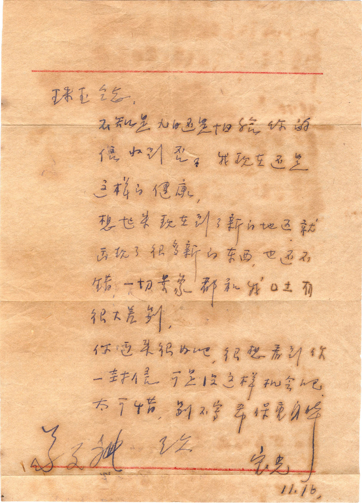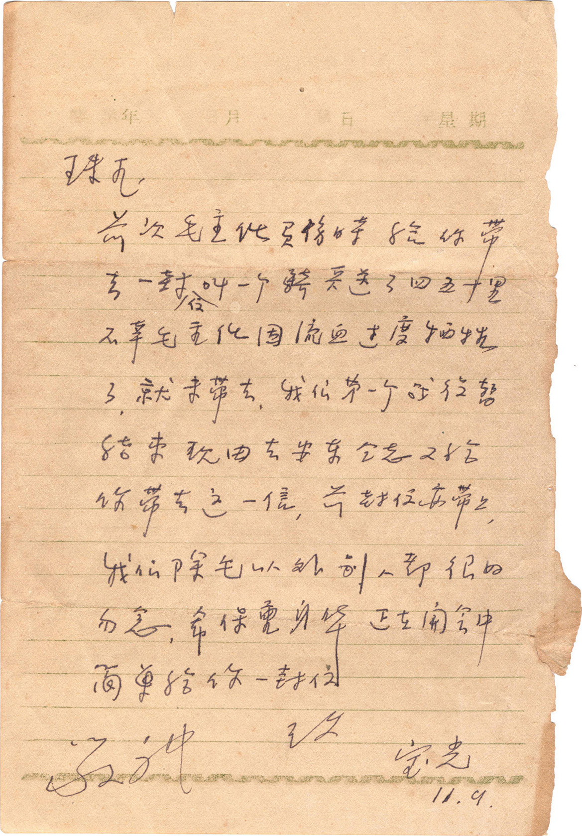 前次毛主任负伤时给你带去一封信,叫一个骑兵送了四五十里,不幸毛主任因流血过度牺牲了,就未带去。我们第一个战役暂结束,现由去安东同志又给你带去这一信,前封信亦带上,我们除毛以外,别人都很好,勿念,希保重身体。正在开会中,简单给你一封信。