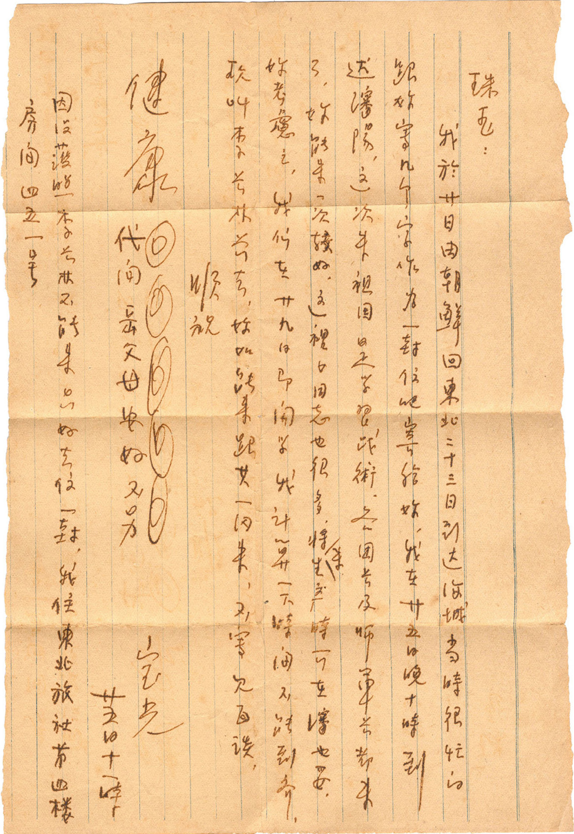 我于廿日由朝鲜回东北,二十三日到达海城,当时很忙的,跟你写几个字作为一封信吧,寄给你。我在廿五日晚十时到达沈阳,这次来祖国是学习战术,各团长及师军长都来了。你能来一次较好,这里女同志也很多,将来生产时可在沈也妥,你考虑之。我们在廿九日即开学,我计算一下时间,不能到齐,故叫李长林前去,你如能来跟其一同来,不写,见面谈。