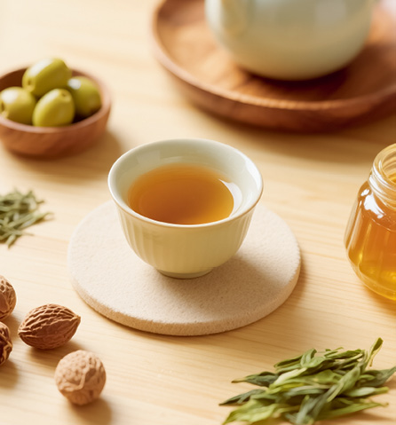 做法: 将橄榄放入水中煮沸,再用橄榄水冲泡胖大海与绿茶,最后加入蜂蜜即可。