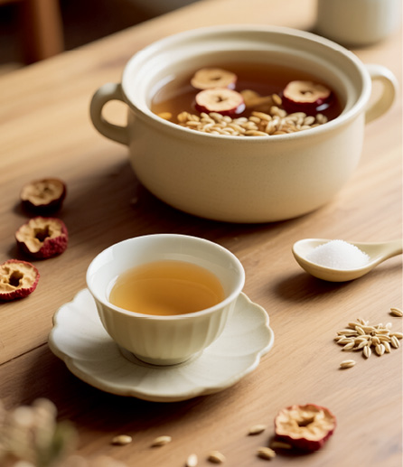 做法: 将山楂洗净、去核、切片,与麦芽一起放入砂锅中,放入适量水大火煮沸,再用文火煎煮20分钟,去渣,加入白糖即可饮用。