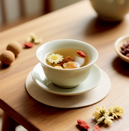 做法: 将桂圆干、菊花和枸杞用沸水冲泡15分钟后即可饮用。