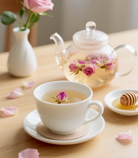 做法: 将玫瑰花放入茶壶,倒入500毫升的热开水,浸泡5分钟即可饮用。