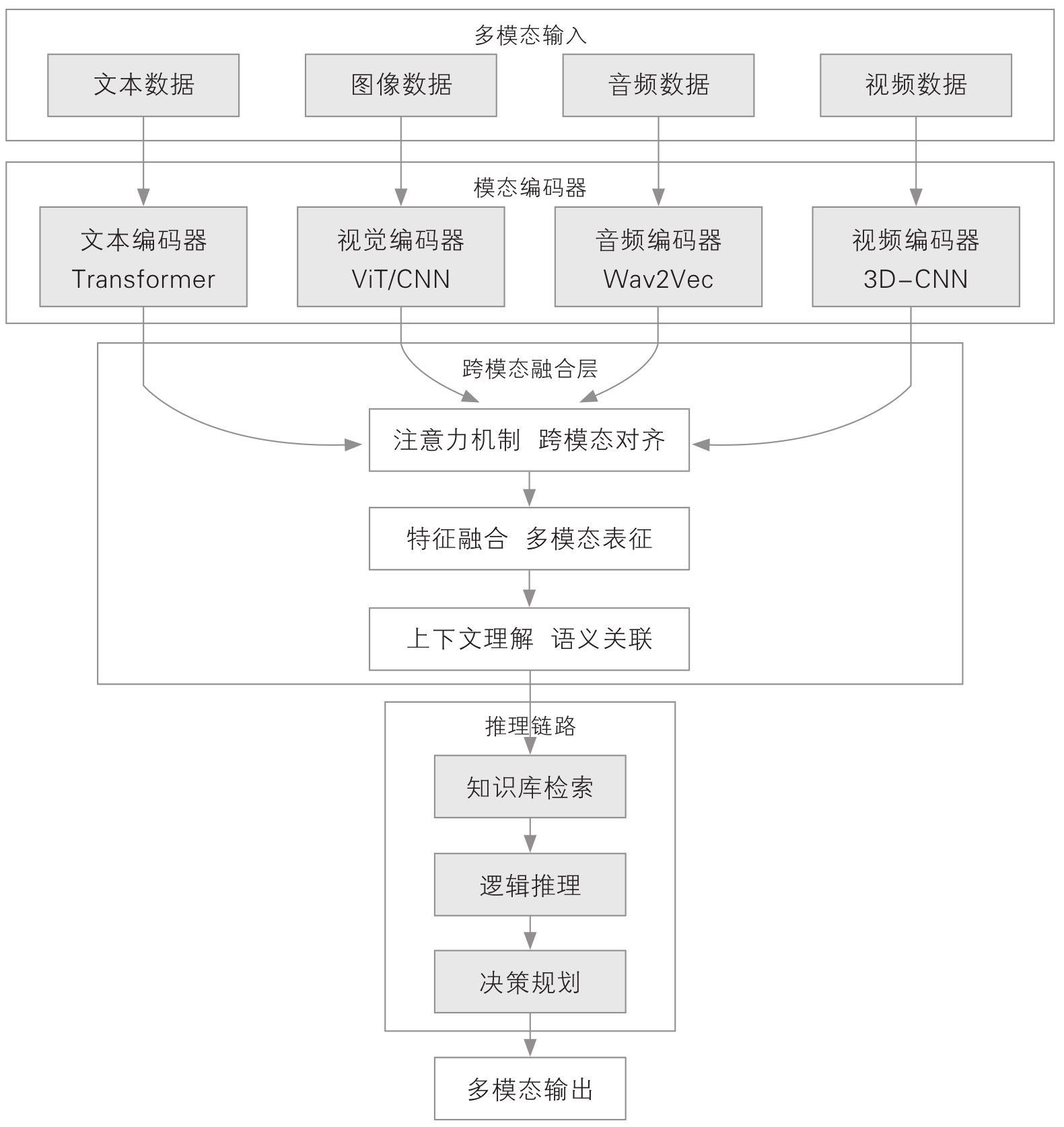 DeepSeek支持文本、代码、图像、音频等多种输入形式,能够灵活应对不同类型的任务和数据。用户可以输入文本,让模型生成相应的图像;也可以输入图像,让模型生成描述图像内容的文本;还可以输入音频,让模型进行语音识别和语义理解。这种多模态输入的支持,使得DeepSeek能够满足用户在不同场景下的需求,为用户提供更加全面、智能的服务。跨模态推理链路流程如图1-3所示。