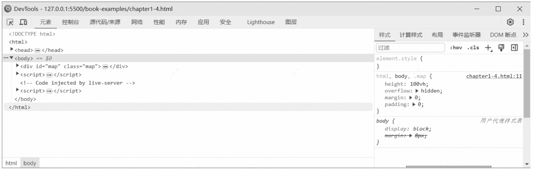 不同的浏览器调试工具可能会存在一些差别,我们以Chrome浏览器为例,按F12键或使用Ctrl+Shift+I组合键,或者在浏览器页面上右击,在弹出的快捷菜单中选择调试工具(或称为开发者工具),如图1-6所示。可以看到,我们所使用的版本共包括10个常用的工具,分别为Elements(元素)、Console(控制台)、Sources(源代码/来源)、Network(网络)、Performance(性能)、Memory(内存)、Application(应用)、Security(安全)、Lighthouse、Layers(图层)。表格1-1对这几个主要工具的功能进行了说明。