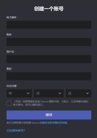 03 单击“注册”按钮后将会进入“创建一个账号”页面,如图2-3所示,输入相应的电子邮件、用户名、密码、出生日期,并单击“继续”按钮,根据提示进行操作,即可注册Discord账号。