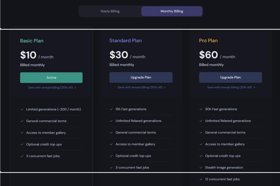 02 弹出的订阅计划界面如图2-19所示,在显示的页面中“Yearly Billing”是年度会员,“Monthly billing”是月度会员,下面三项分别为月度会员基础版(Basic Plan)、标准版(Standard Plan)、专业版(Pro Plan)的费用标准。各个套餐绘图的算法和功能是一样的,区别主要在于可以使用的 GPU 时间等权益上。
