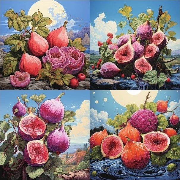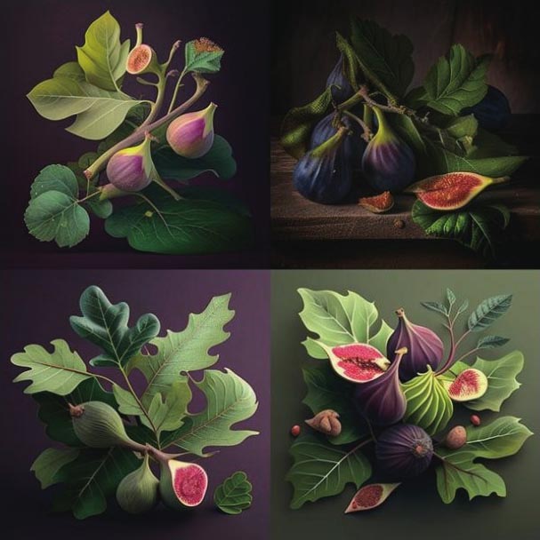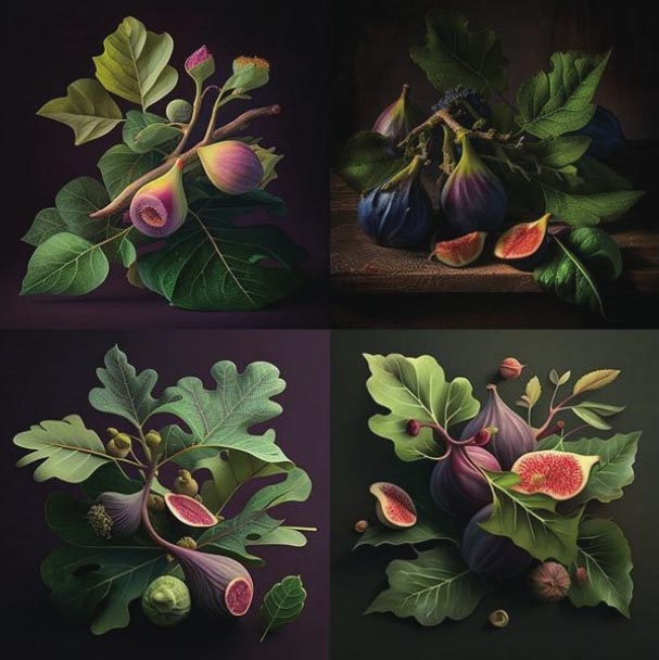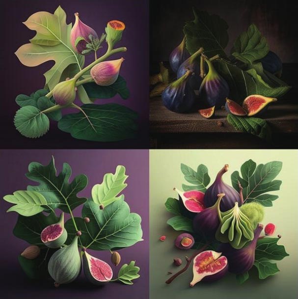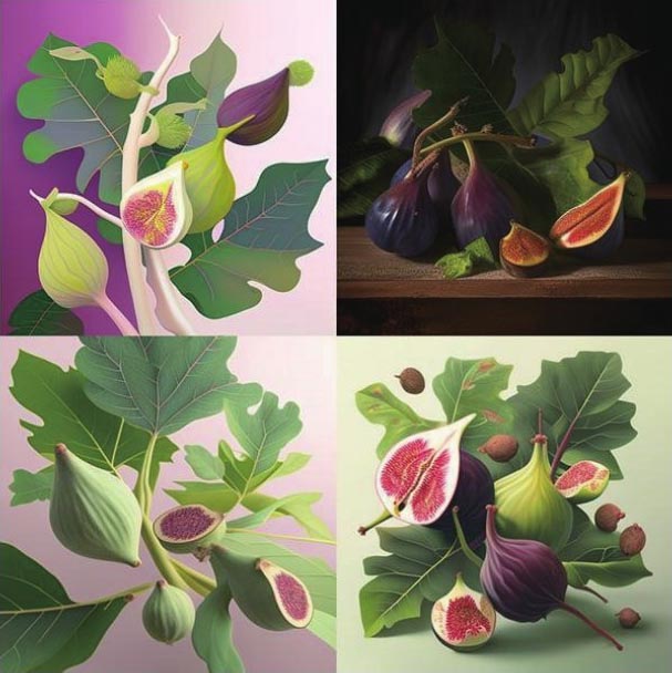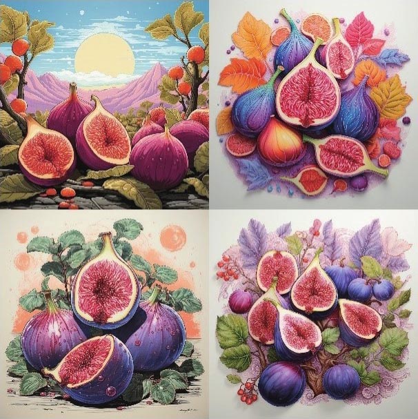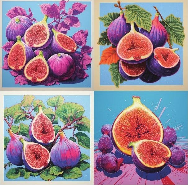如图2-64(--stylize 50)、图2-65(--stylize 100 ,默认值)、图2-66(--stylize 250)、图2-67(--stylize 750)所示,提示词的主体部分都是“illustrated figs”(无花果插图),只是 stylize 的值不同。