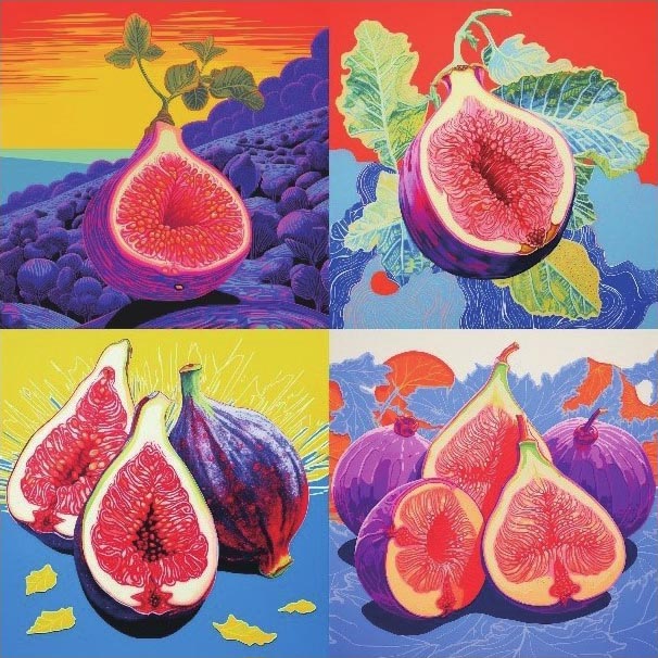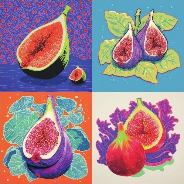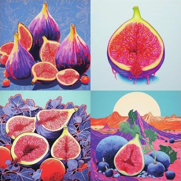 如图2-68(--stylize 0)、图2-69(--stylize 50)、图2-70(--stylize 100,默认值)、图2-71(--stylize 250)、图2-72(--stylize 750)、图2-73(--stylize 1000)所示,提示词的主体部分都是“colorful risograph of figs”(彩色的无花果里索图),只是 stylize 的值不同。