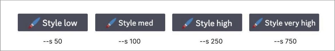 stylize 有两种使用方式:可以在提示词末尾添加“--stylize <数值>”;也可以键入“/settings ”并从菜单中选择自己喜欢的风格化值。如图2-63所示。