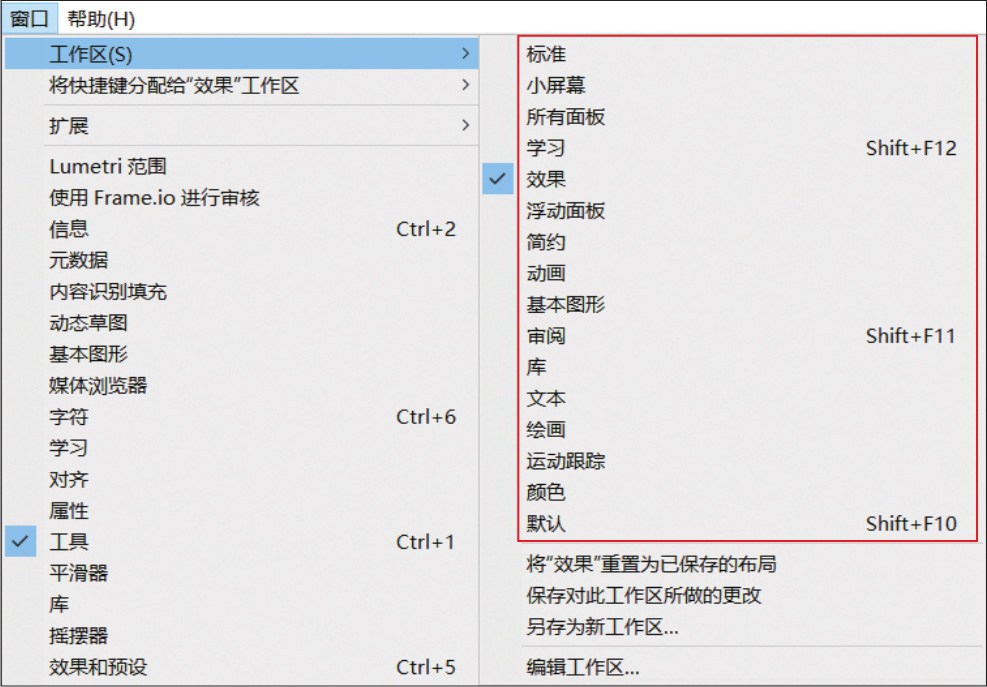 如果不小心弄乱了工作区,可以在“窗口”>“工作区”子菜单中选择相应命令重置布局。例如,弄乱了当前的“效果”工作区,可以选择“将‘效果’重置为已保存的布局”命令,这样就能将“效果”工作区恢复到默认布局。
