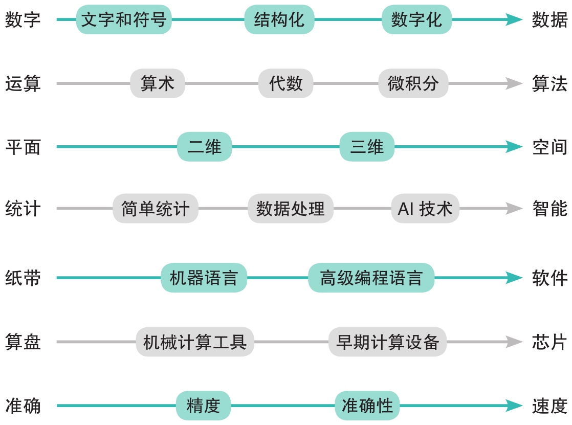 计算本身无比宏大,但并非深不可测。我们将从7个维度来剖析计算——“记录的发展:从数字到数据”“方法的演变:从运算到算法”“视界的扩展:从平面到空间”“追求的革新:从统计到智能”“流程的更替:从纸带到软件”“硬件的换代:从算盘到芯片”“追求的改变:从准确到速度”。7个维度相互补充、纵横交错。