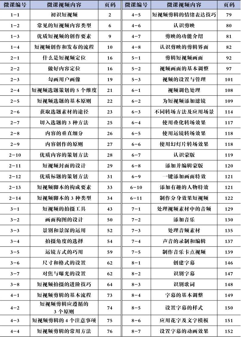 (1)精心编排,浅显易懂 。本书立足于短视频创作的基础理论,以剪映为核心工具,在编排内容时,采用“理论知识+实践操作”的结构,着重选择短视频创作过程中必备、实用的知识和技能进行讲解,将复杂难懂的知识和技能通过专业的体系结构划分和深入浅出的讲解,变成读者能够轻松阅读和上手的内容。
